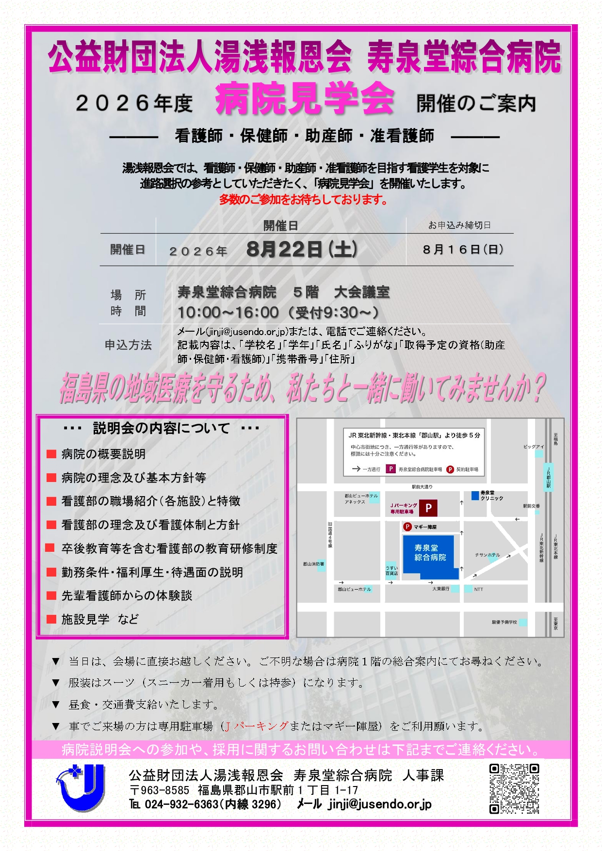メールの場合は下記内容を送信してください。 件名:病院見学会の申し込み 本文:「学校名」「学年」「氏名」「ふりがな」「取得予定の資格(助産師・保健師・看護師・准看護師)」「携帯番号」「住所」 |