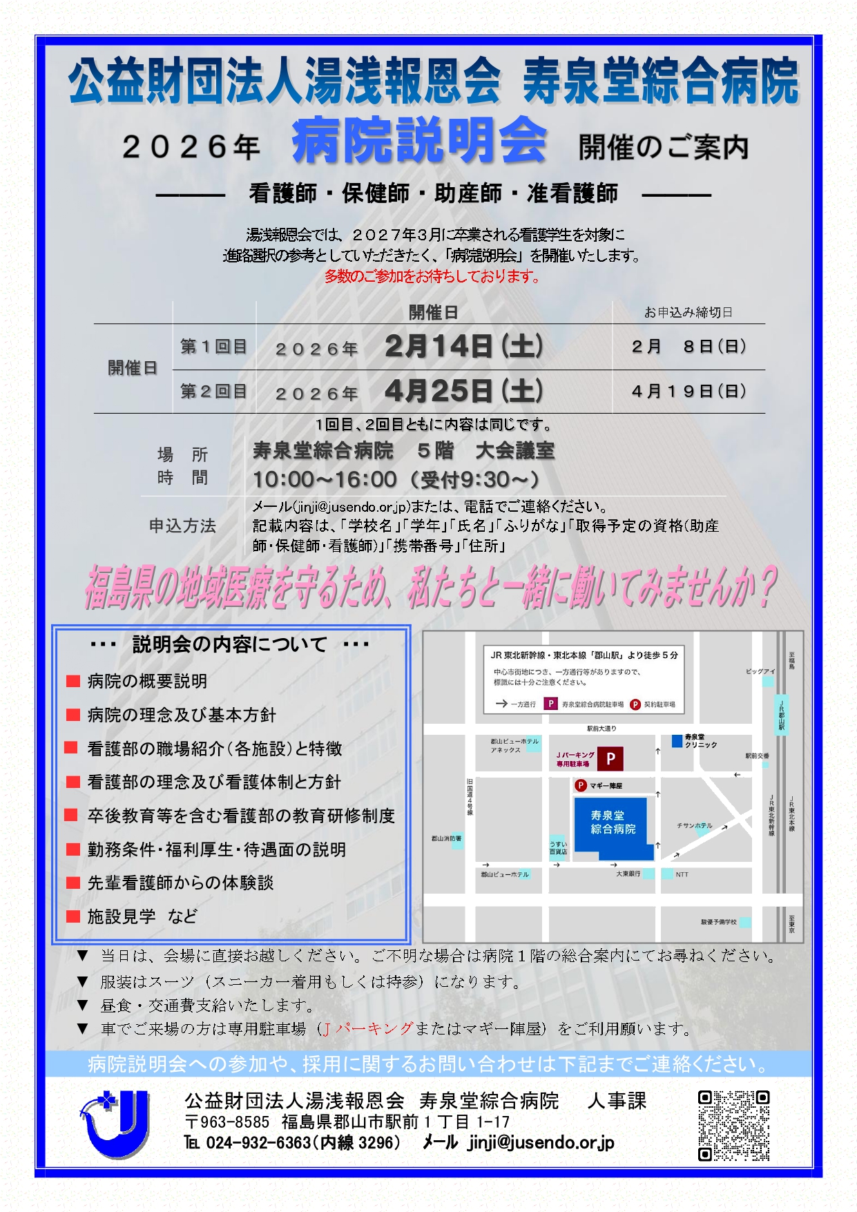 メールの場合は下記内容を送信してください 件名:第○回目 病院説明会の申し込み 本文:「学校名」「学年」「氏名」「ふりがな」「取得予定の資格(助産師・保健師・看護師)」「携帯番号」「住所」 |
