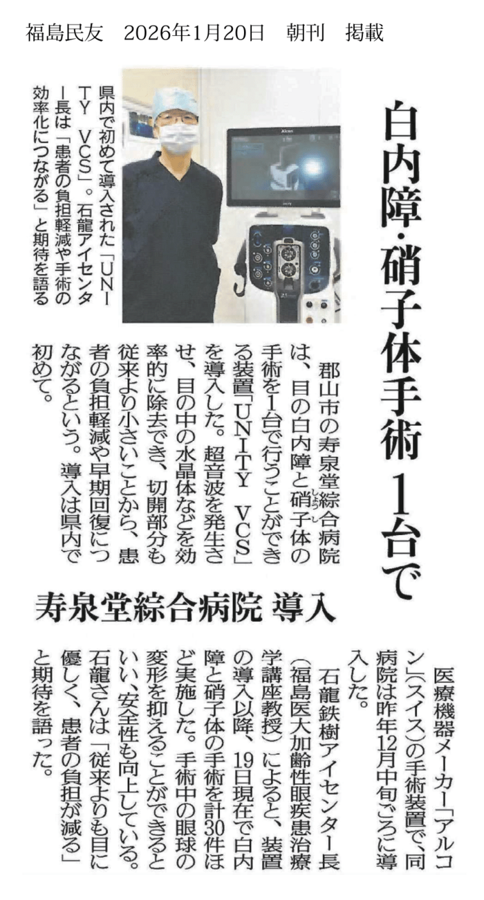 福島民友に当院で導入した眼科「白内障・硝子体手術装置」が取り上げられました(寿泉堂綜合病院)