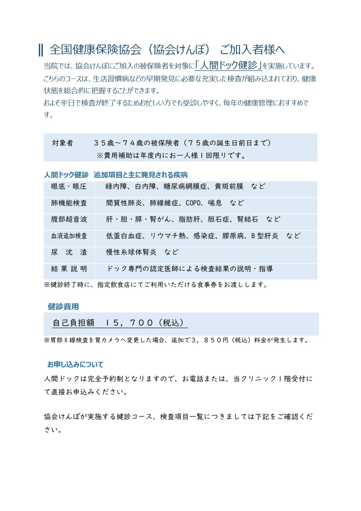 2026.3. 7 協会けんぽ健診の受付開始について(寿泉堂クリニック) 令和8年度(2026年4月1日~)の協会けんぽ健診の受付を下記日時より開始いたします。 〇受付開始日 令和8年3月9日(月) 〇受付時間 平日8:30 ~ 12:00、13:30 ~ 17:00 土曜8:30 ~ 12:45 〇電話番号 024-939-4616 ※お電話にてお申し込みください。 健診内容 ・生活習慣病予防健診(一般健診) ・人間ドック健診 ・節目健診(付加健診) ・乳がん検診 ・子宮がん検診 ・骨粗しょう症検診